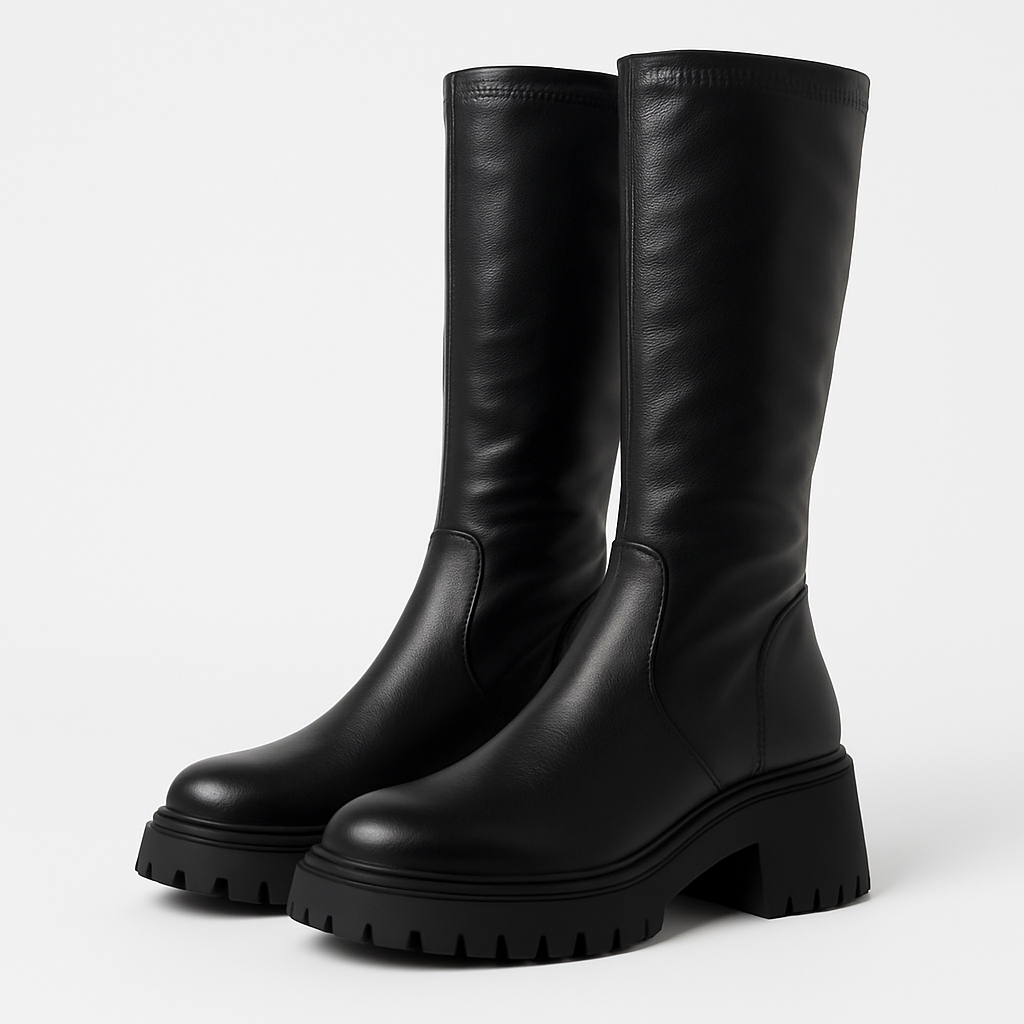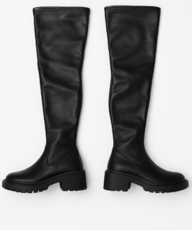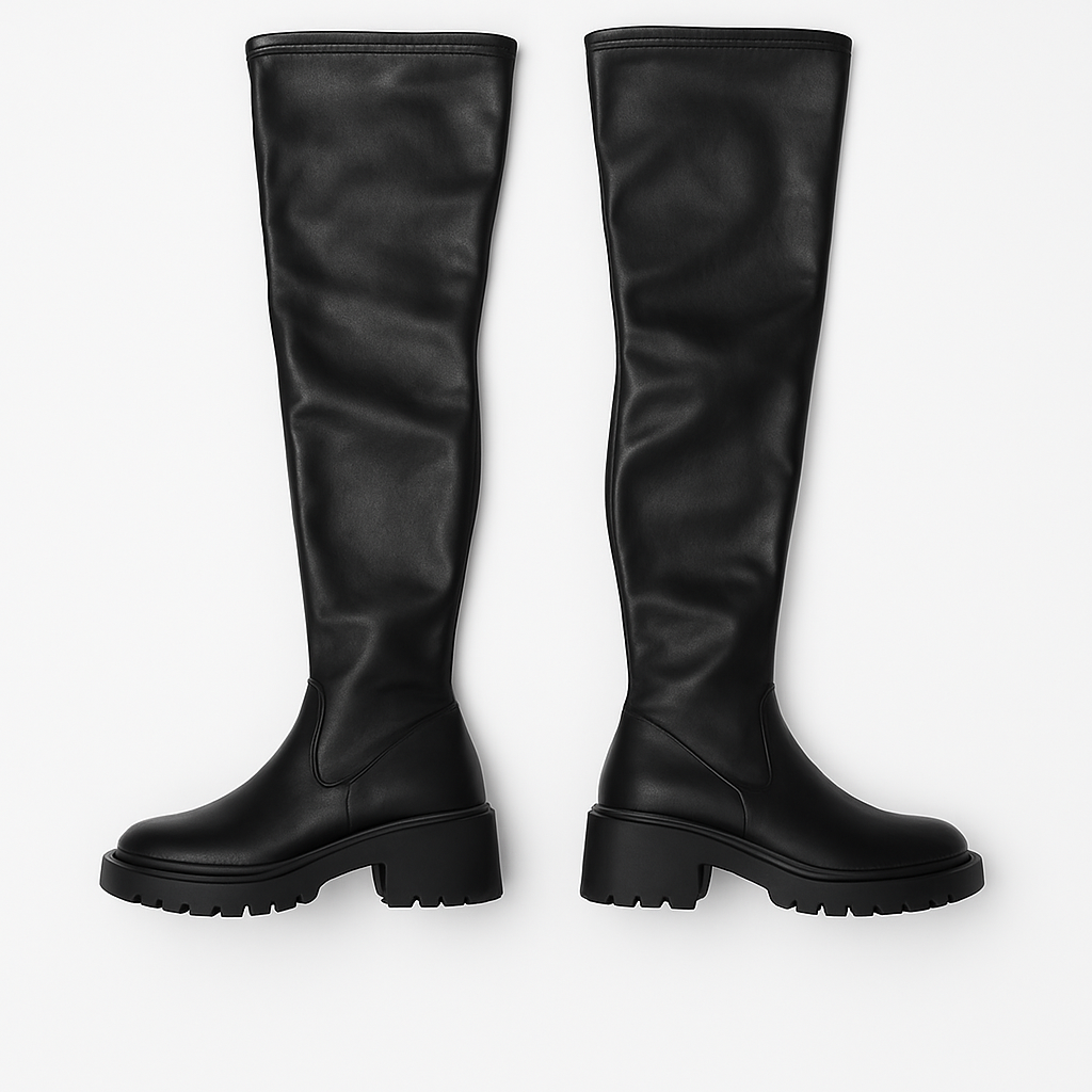Over-the-knee stretch boots in a sleek matte finish with a chunky lug outsole for secure traction. Lightweight yet sturdy, the snug shaft hugs the leg and slips on easily. Ideal for winter streetwear; pairs well with skirts, knits, or denim for everyday style.