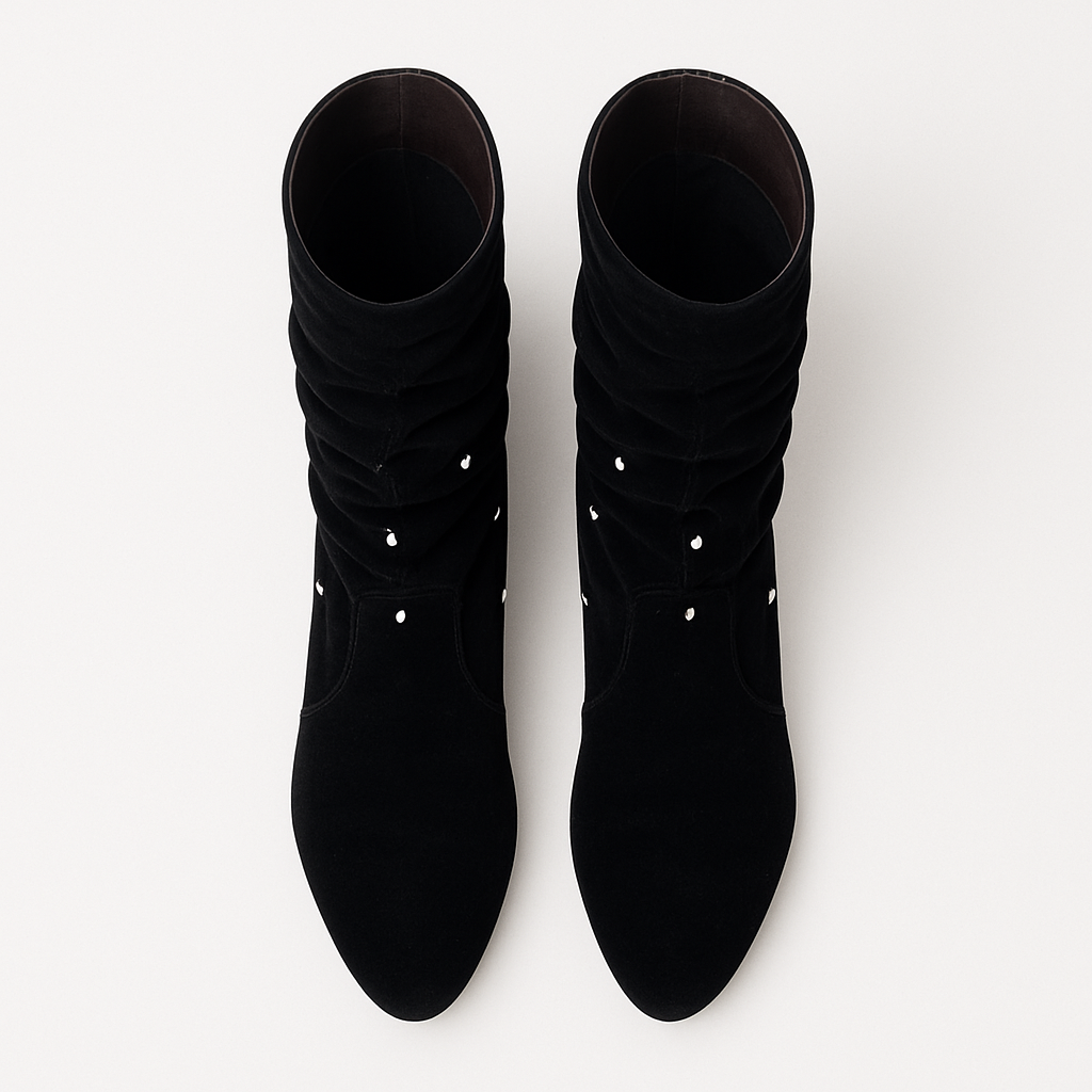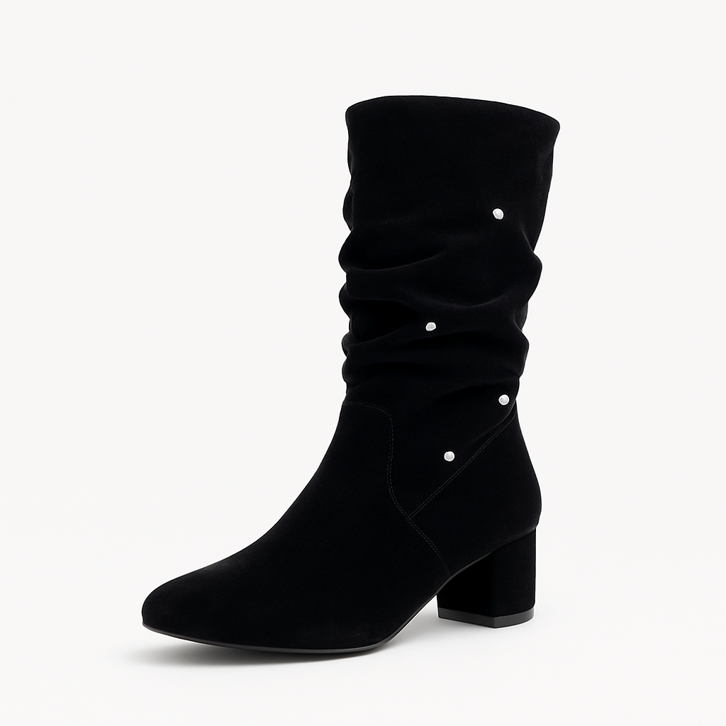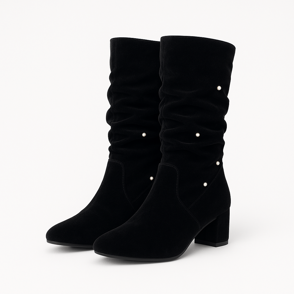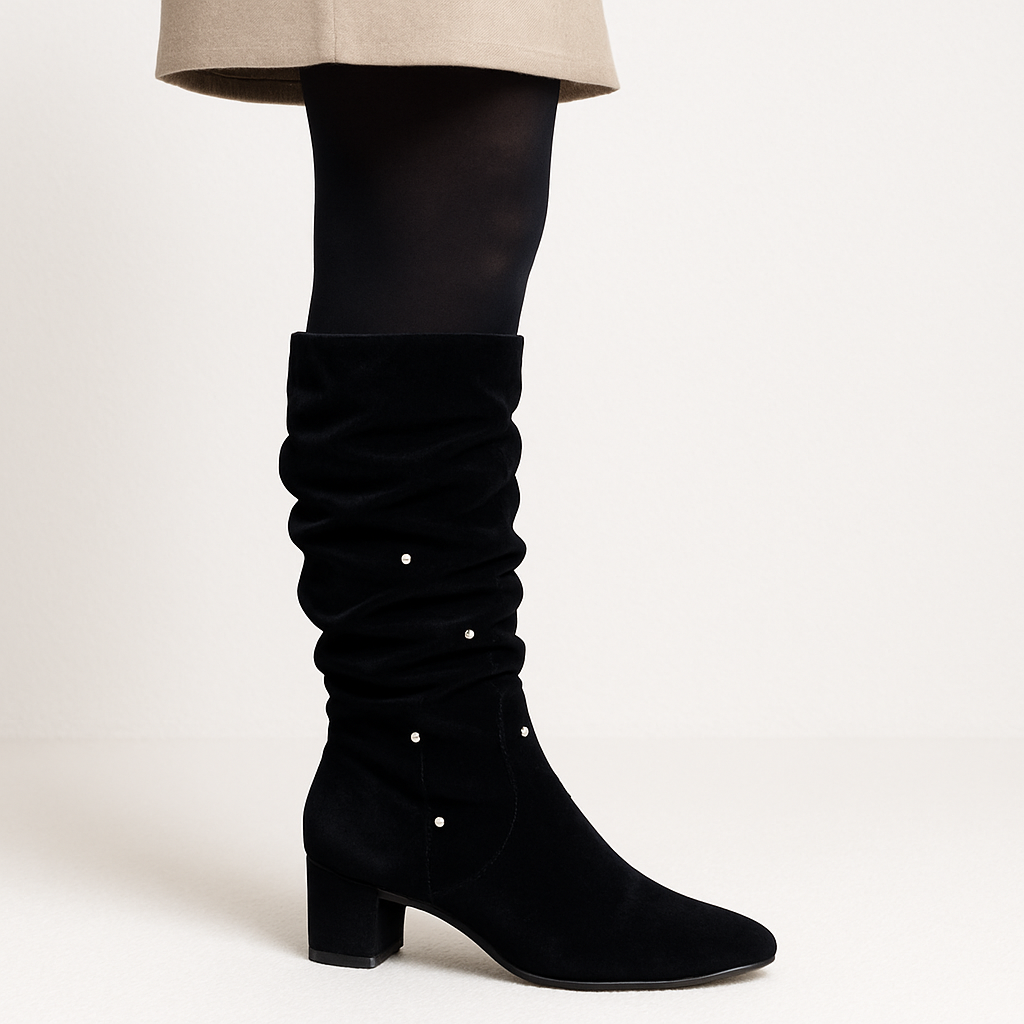 Elegant black velvet knee-high boots with a soft slouch, finished with subtle pearl-style studs and a comfortable block heel. Designed for all-day poise, the pointed toe streamlines the look while the cushioned footbed keeps every step steady. Pair them with dresses, leggings or denim for evening outings, festive events or winter workwear. Crafted to stand out without shouting, these boots deliver luxe texture, versatile styling and dependable comfort in one polished package.