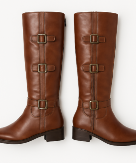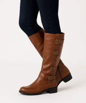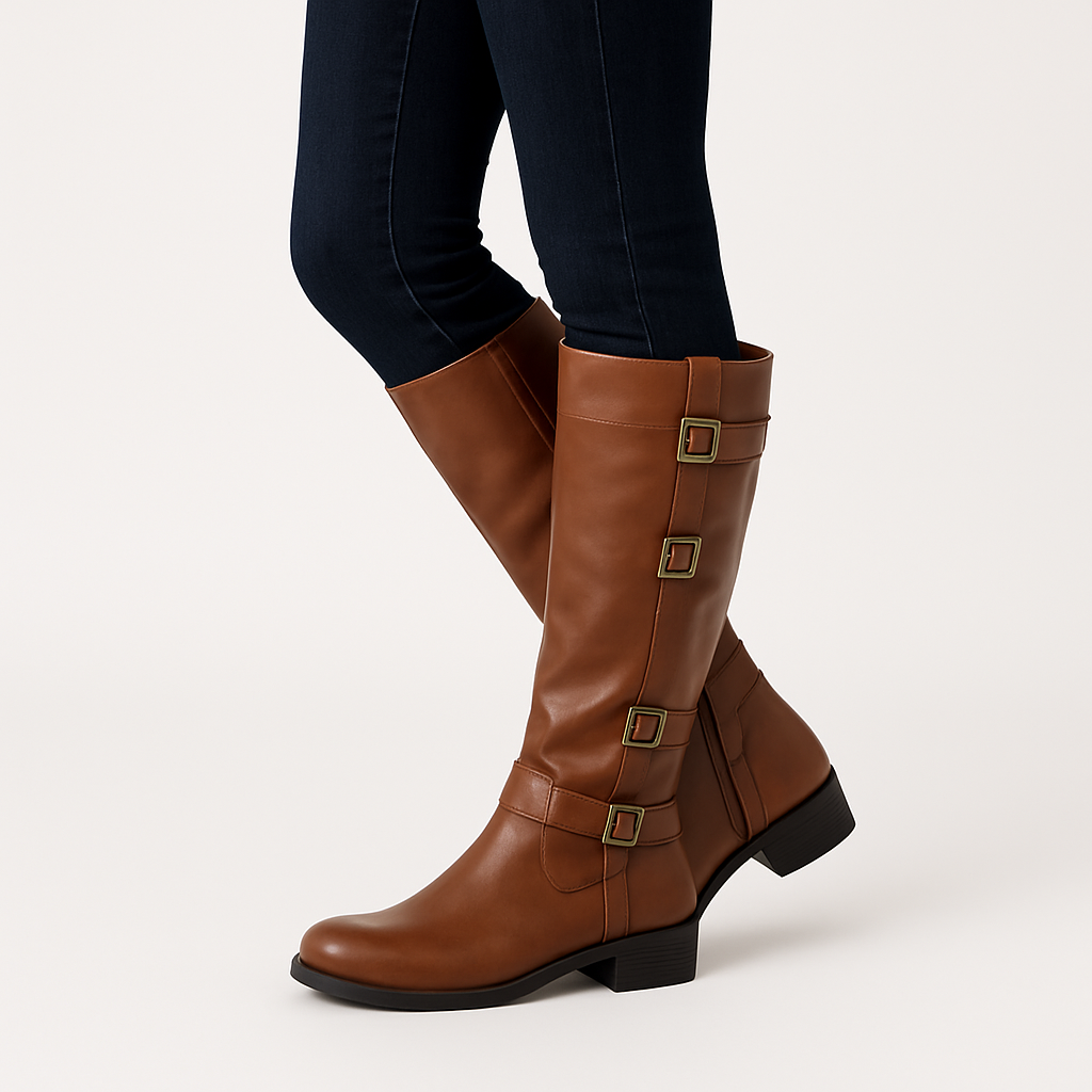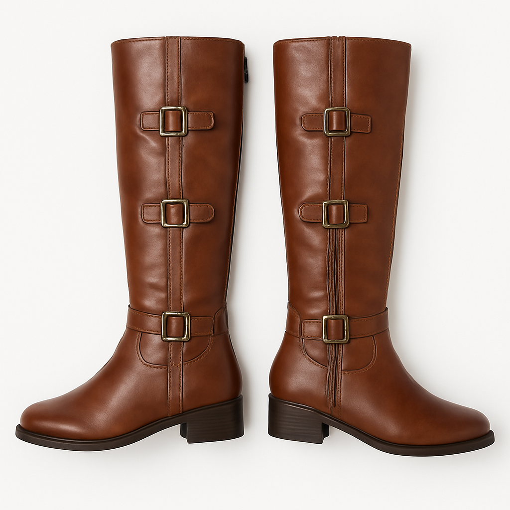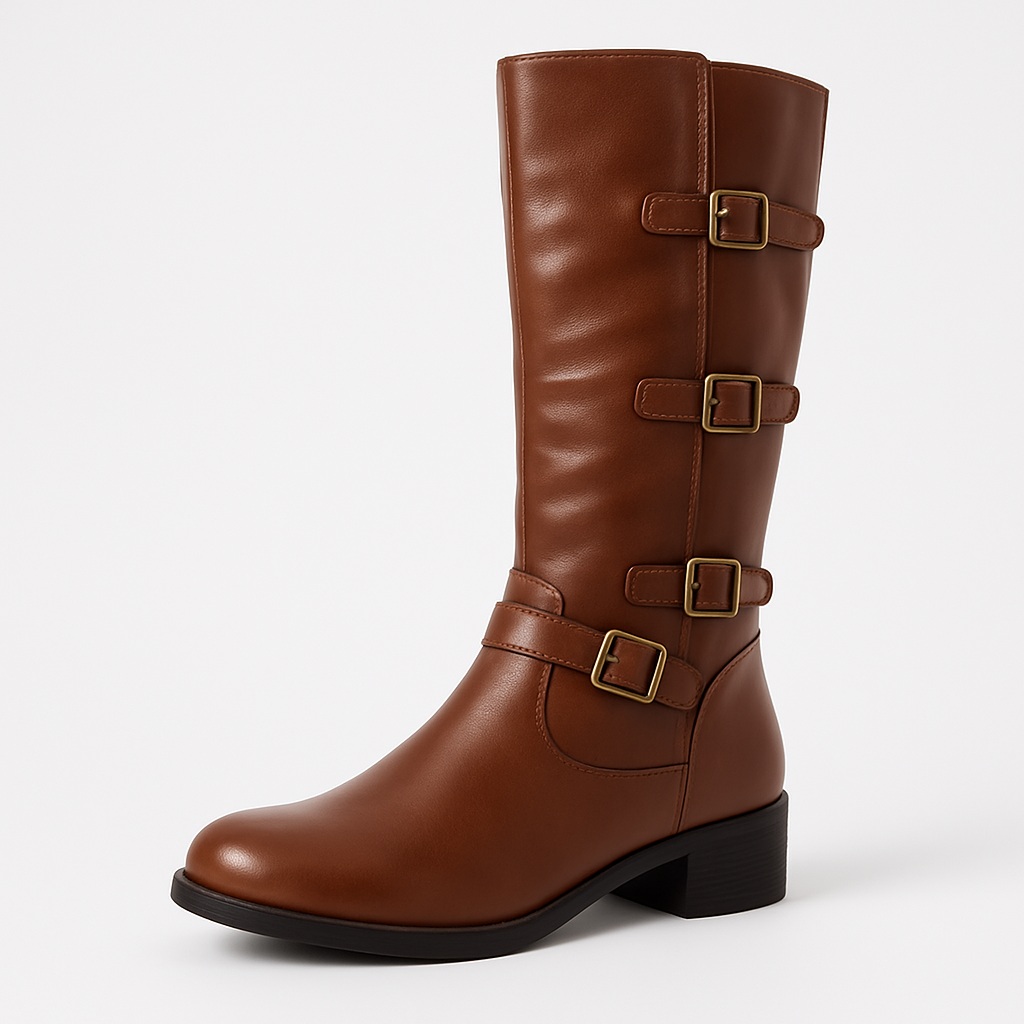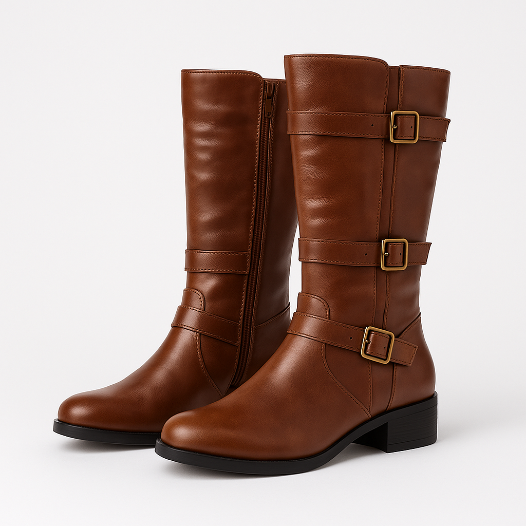 Mid-calf ladies boots in smooth faux leather with a secure side zipper and low block heel for all-day comfort. Triple buckle detailing adds style, while the soft lining and grippy sole keep steps steady. Pairs easily with jeans, dresses, or leggings for smart-casual looks.