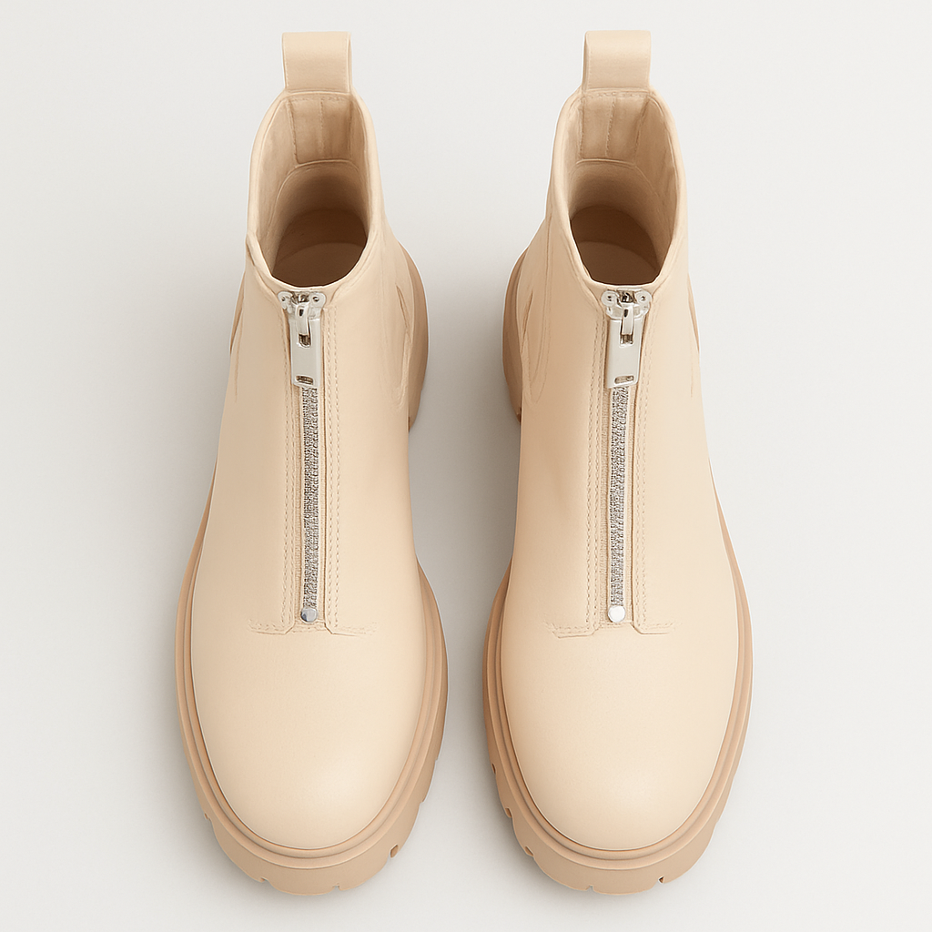 Versatile ankle boots in a soft beige tone featuring a sleek front zipper, ribbed stretch gussets and a chunky lug sole for confident traction. Designed for everyday wear, the round toe and block heel balance style with stability while the smooth PU upper keeps maintenance simple. Pair them with jeans, dresses or workwear for an instant, modern upgrade. Ideal for all-season use, these boots offer a secure fit, easy on?off access and a neutral colour that matches most wardrobes.