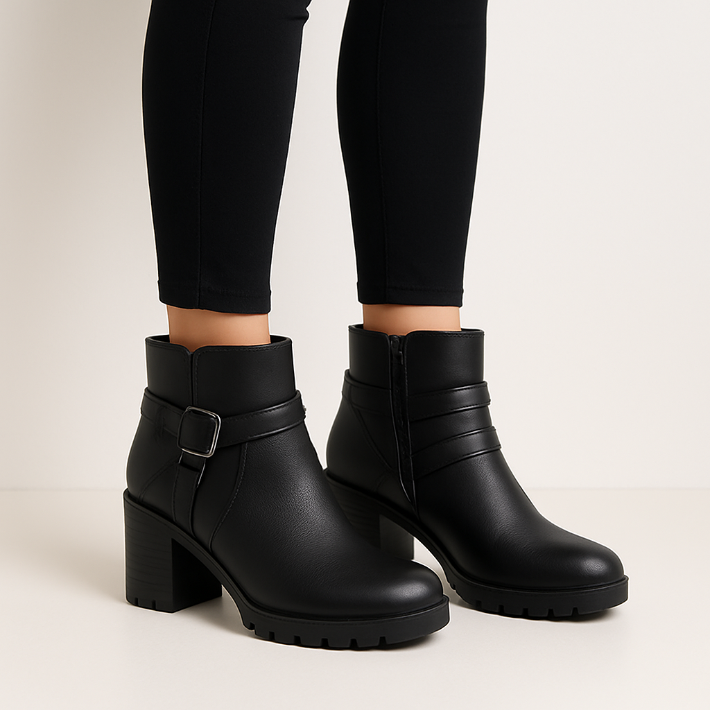 Ladies Black Block-Heel Ankle Boots with Buckle & Side Zip