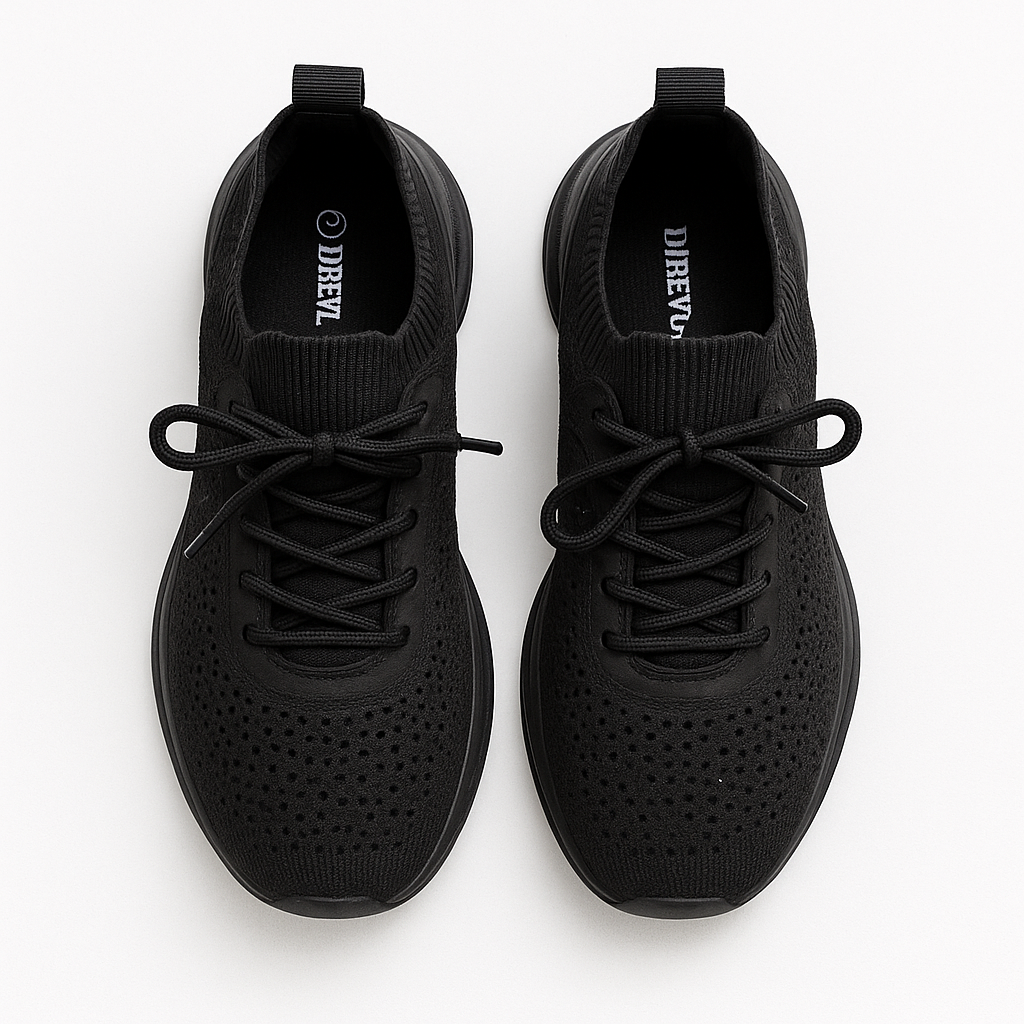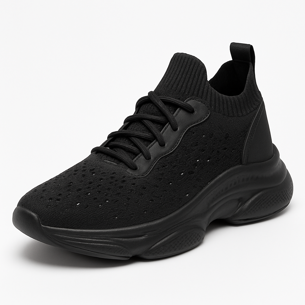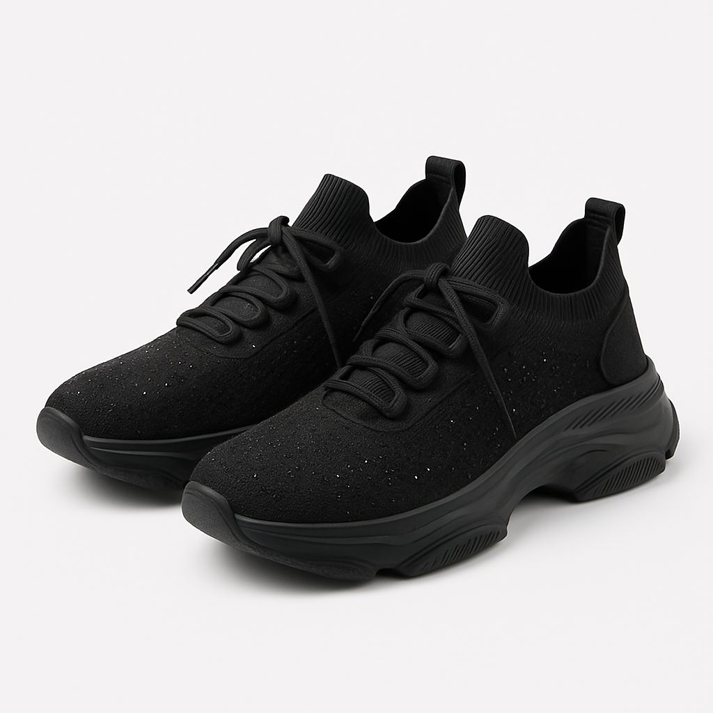Breathable black knit sneakers with rhinestone sparkle and a cushioned chunky sole deliver all-day comfort and style. Lace-up fit with snug sock collar; lightweight grippy outsole. Great for walks, travel and athleisure; spot clean and air dry.