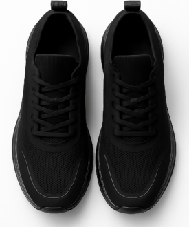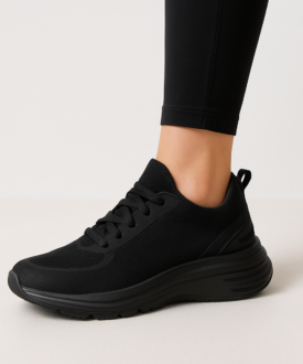 Lightweight, all-black lace-up walking sneakers designed for all-day comfort and urban athleisure. A breathable knit upper keeps feet cool, while the thick, shock-absorbing foam midsole and grippy rubber outsole soften every step. Subtle overlays add durability and structure without adding weight. Easy pull tabs and a padded collar make on/off simple. Ideal for daily walking, commuting, travel and casual wear with leggings or denim.