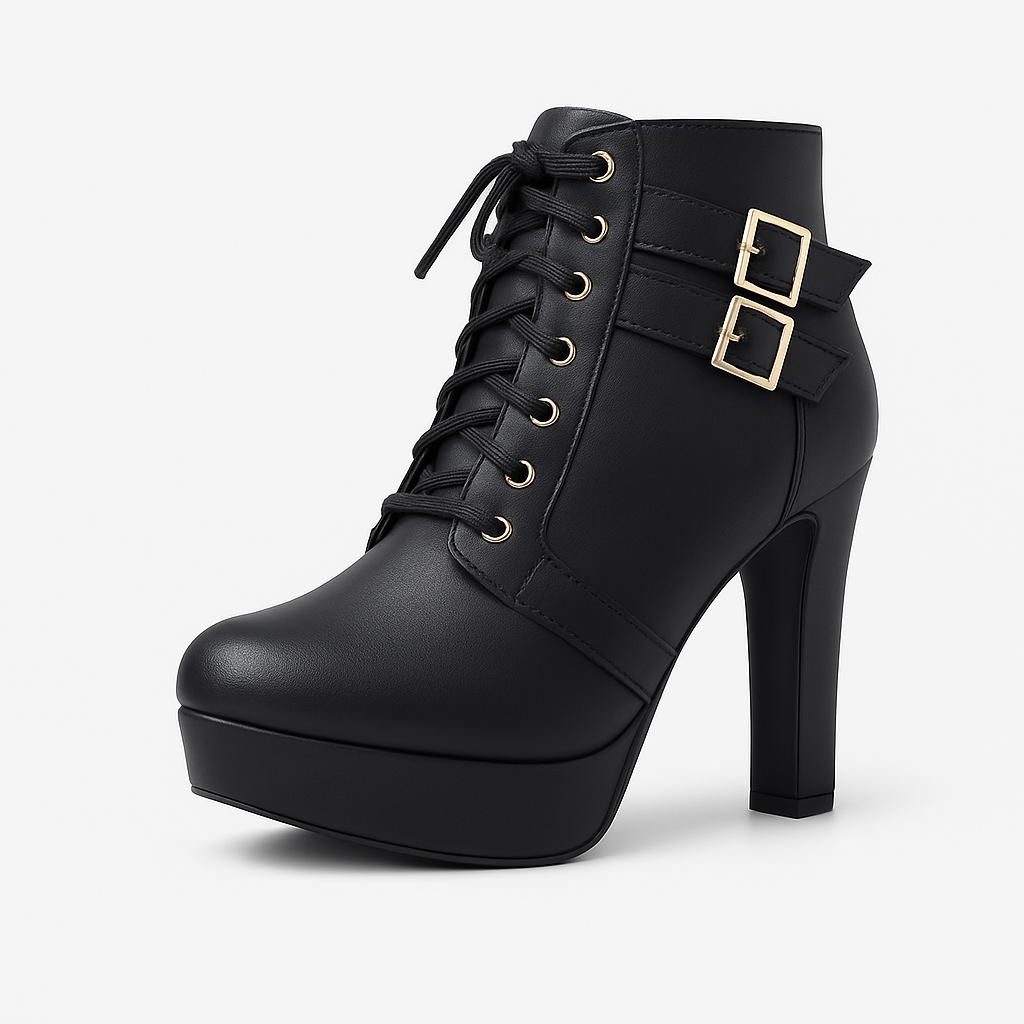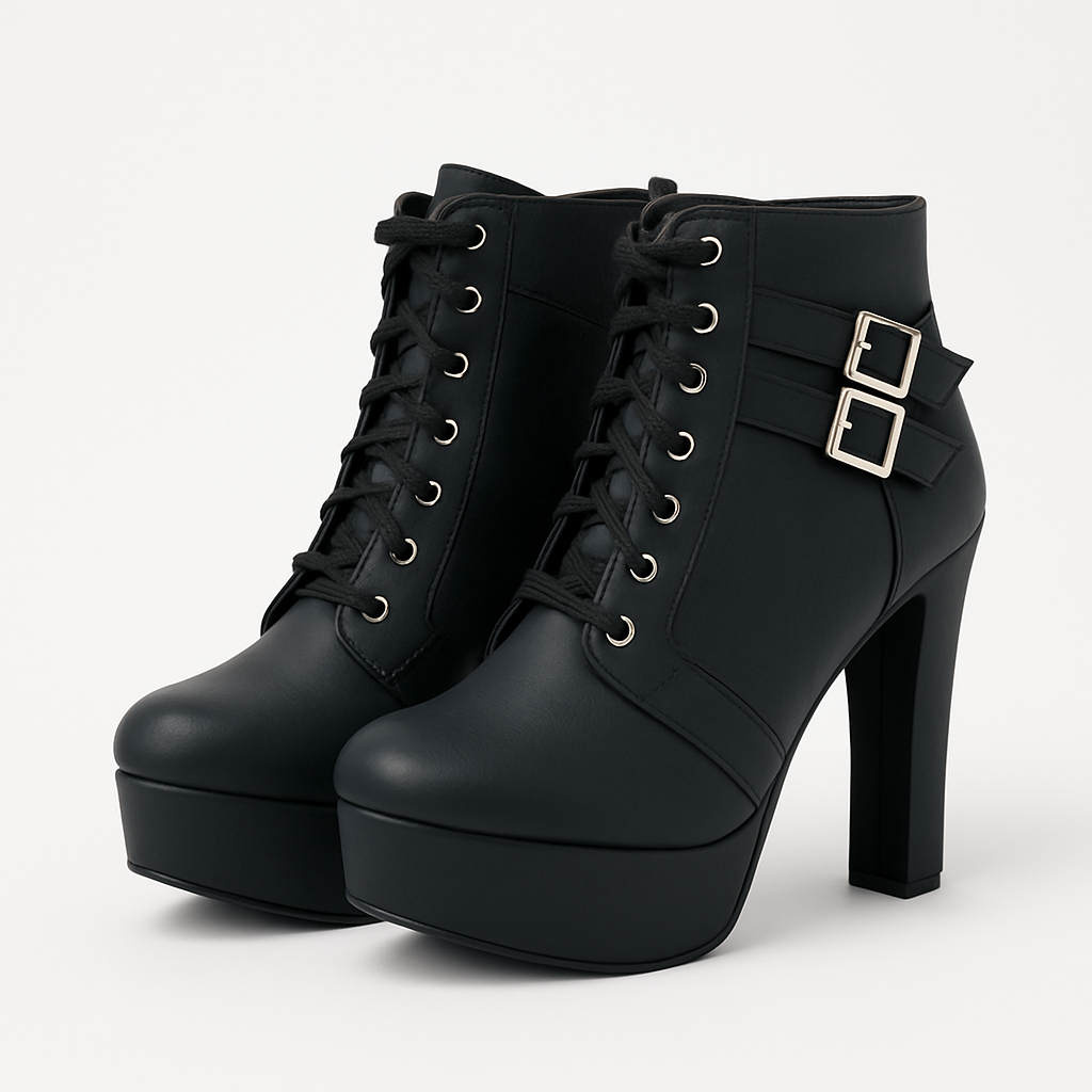 Sleek, all-black ankle boots designed for statement height and everyday confidence. A tall block heel and front lace-up give secure support, while twin side buckles add a polished edge. The closed, mid-top design works across seasons?pair with denim, dresses or night-out fits. Textured outsole aids grip and a cushioned feel keeps you comfortable for longer wear. Ideal for customers seeking versatile, fashion-forward platform boots in extended sizes for ladies.