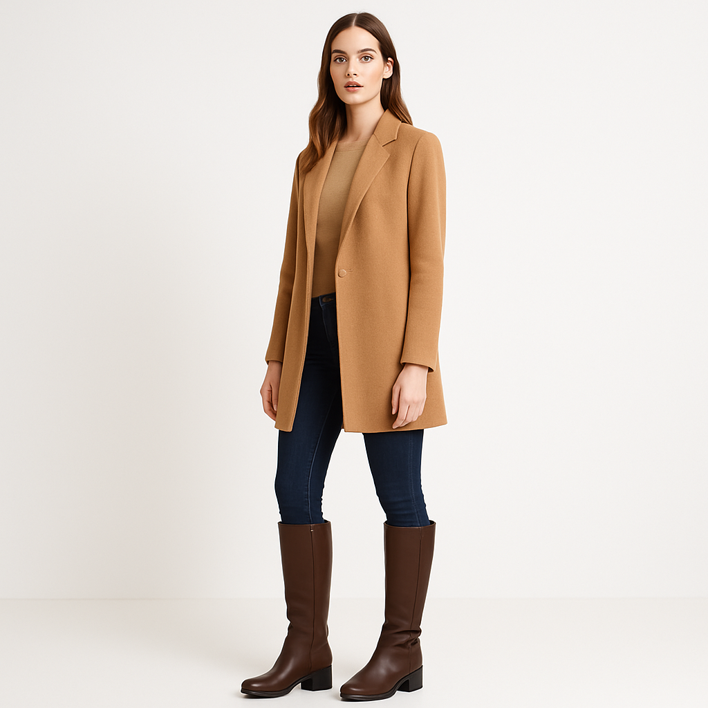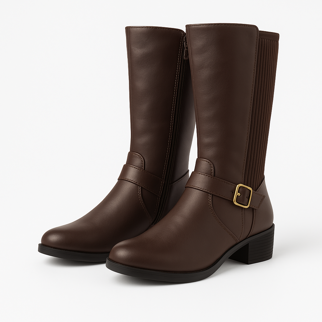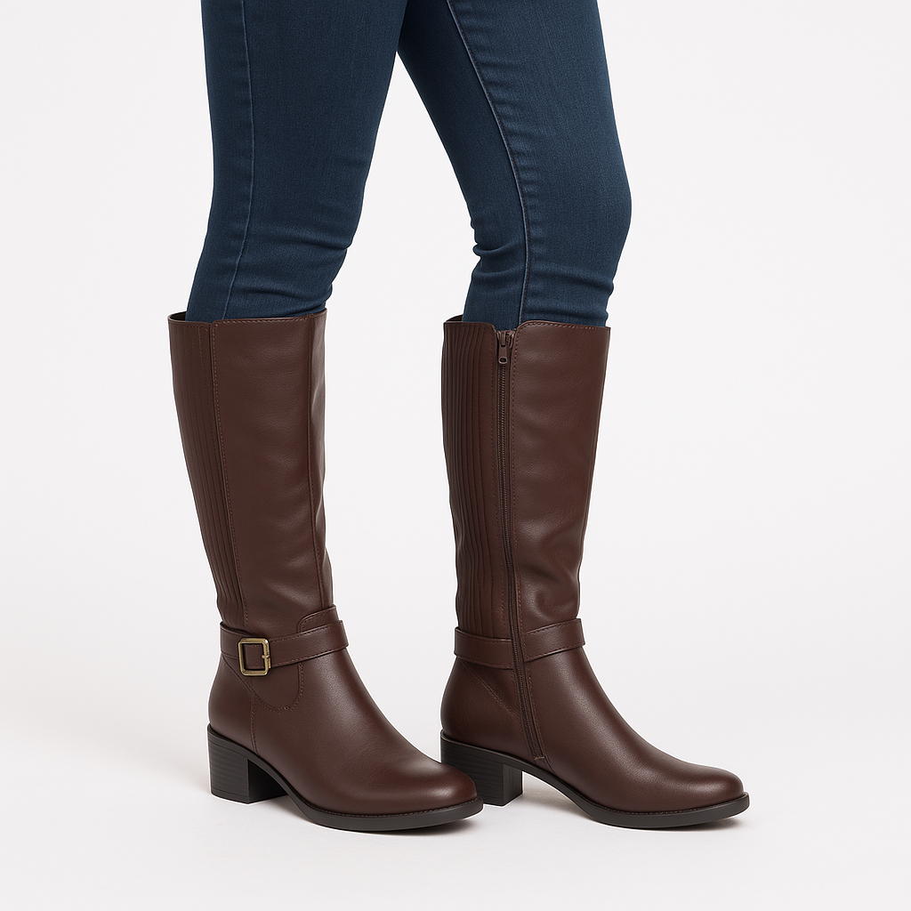 Ladies Brown Knee-High Riding Boots with Side Zip & Buckle