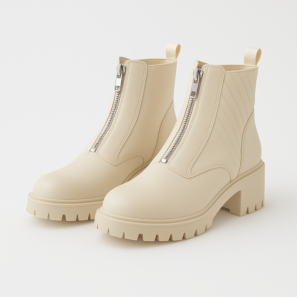 These ladies? chunky ankle boots bring sleek style and everyday comfort together. Crafted in a smooth cream faux-leather with a bold front zipper, they feature a rib-quilted side panel, cushioned lining and a grippy lug sole for confident traction. The mid-ankle height flatters with jeans, dresses or winter layers, while the neutral tone pairs with everything. Designed for quick on-off and all-day wear, they?re an easy upgrade for work, weekend and travel.