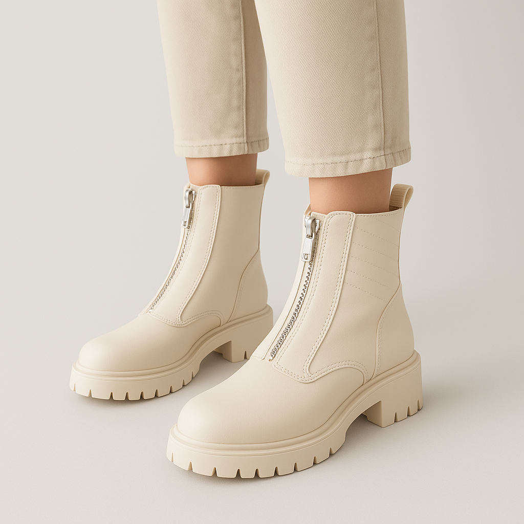 Ladies chunky front-zip ankle boots in cream lug sole