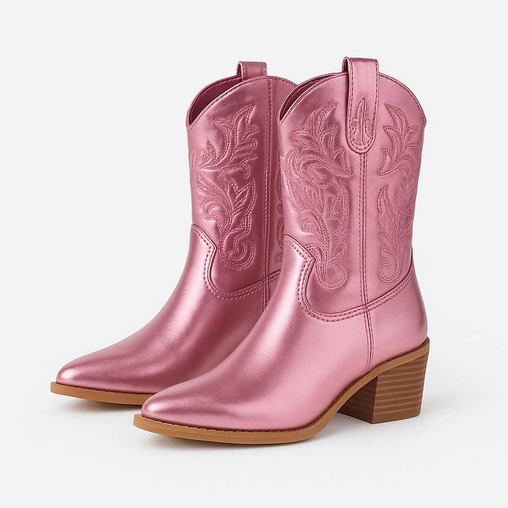 Shine on in these ladies? metallic pink western cowboy boots. The mid-calf shaft with classic embroidery adds true cowgirl character, while a comfortable stacked block heel and pointed toe create a sleek, elongating look. Durable outsoles provide grip for daily wear, parties, festivals, and concerts. Designed to pair effortlessly with denim, dresses, and Indo-fusion outfits, these boots deliver standout style without sacrificing comfort. Ideal for all-season statement dressing and easy day-to-night transitions.