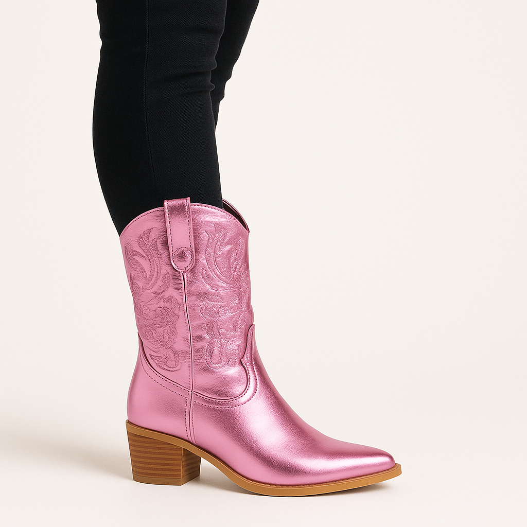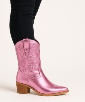 Tags: block heel boots, cowgirl boots India, metallic pink cowboy boots, mid calf boots, party boots for women, pointed toe boots, western boots for women
