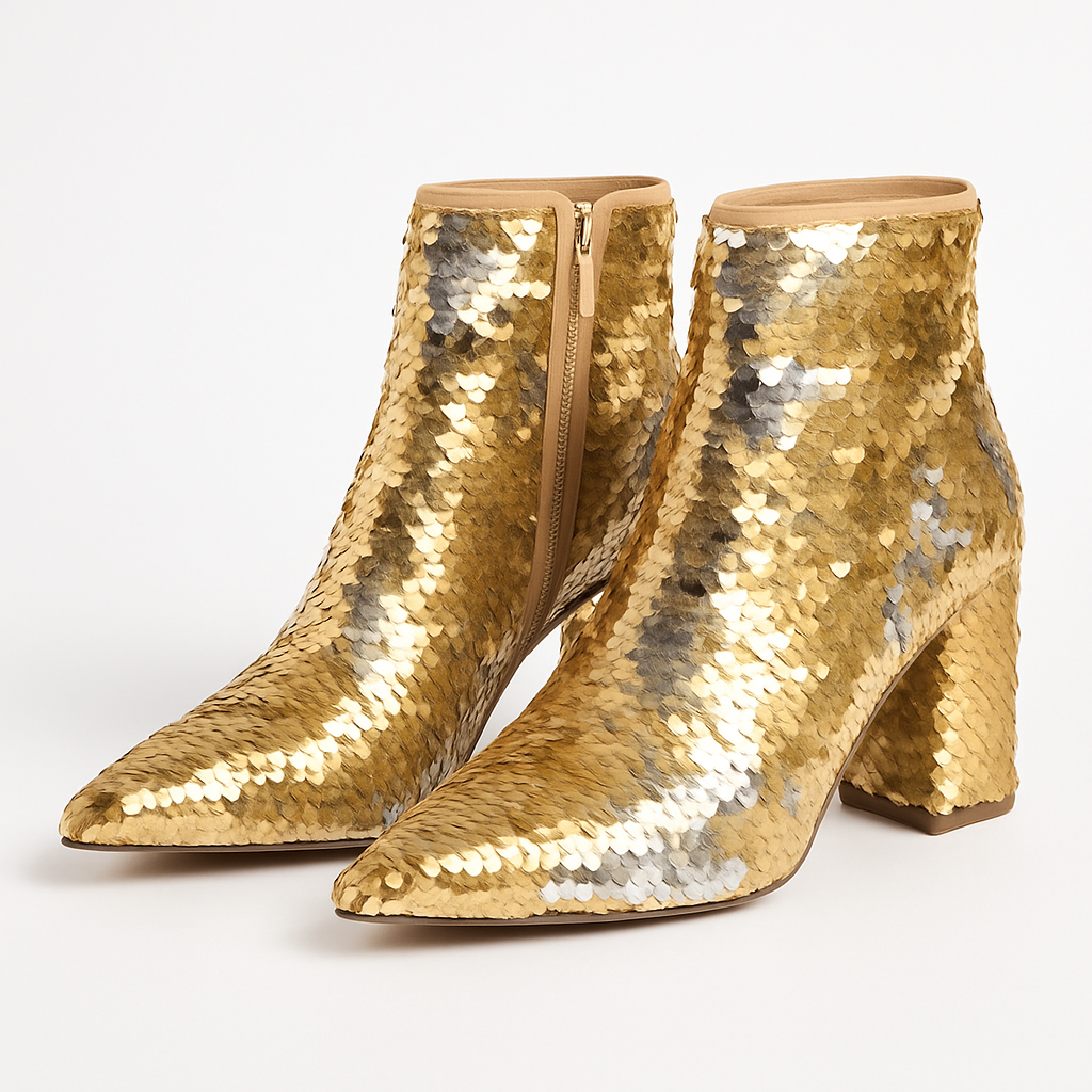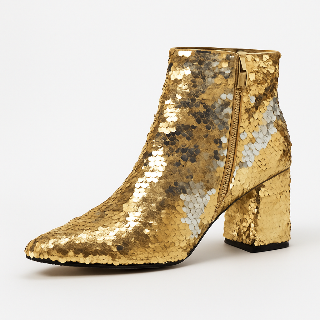 Ladies sequin ankle boots with block heel ? gold & silver glam