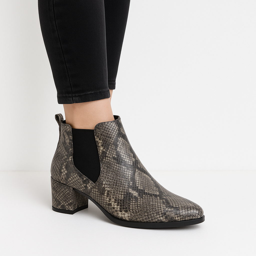 Add instant edge to your wardrobe with these ladies? snake-print Chelsea ankle boots. Crafted in a sleek faux-snakeskin upper with elastic side gussets and a handy pull tab, they feature a comfortable mid block heel and a slightly pointed toe for a refined silhouette. The grippy outsole and soft lining make them ideal for all-day wear, from jeans to dresses. Designed in size 6 for a true-to-size fit, these boots bring statement style without compromising comfort.