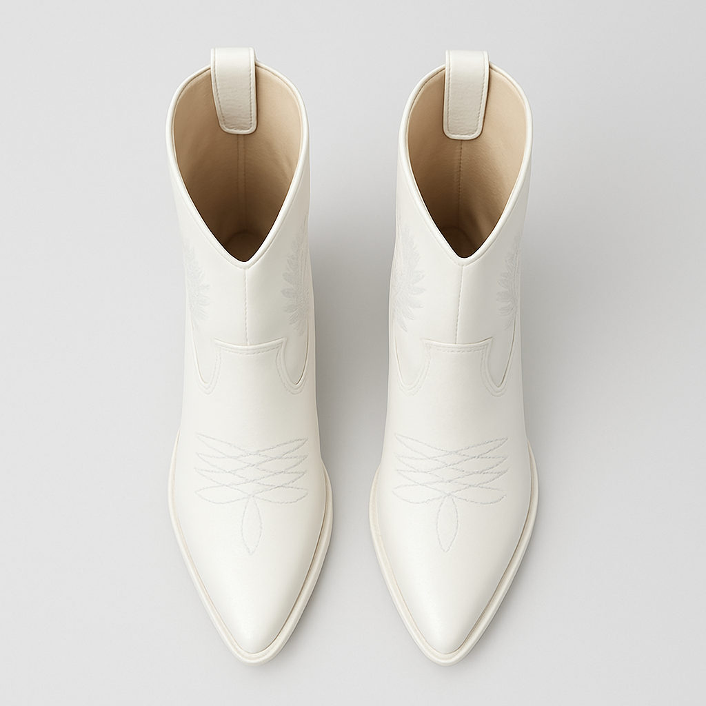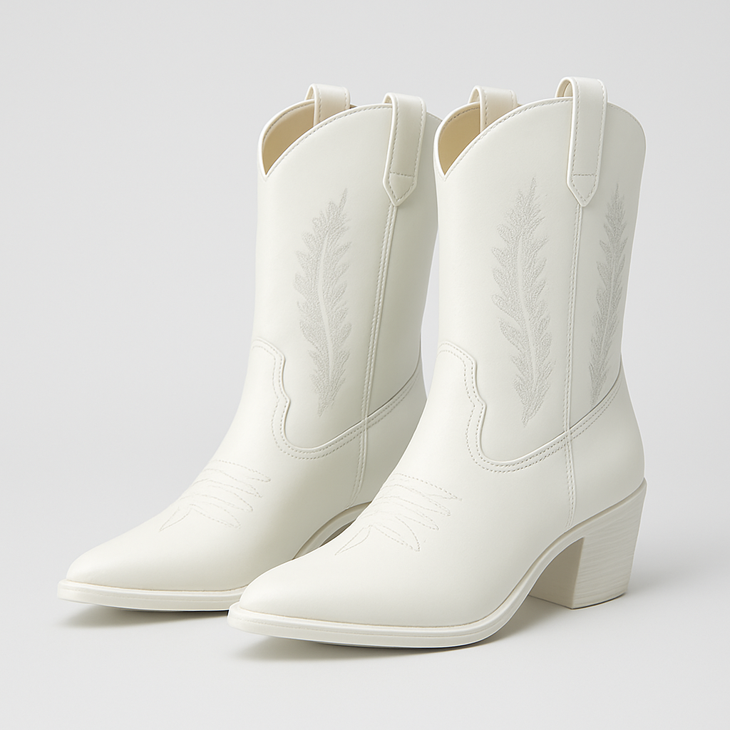 Tags: block heel boots, faux leather western boots, mid calf boots, pointed toe boots, western boots ladies embroidered boots, white cowboy boots women