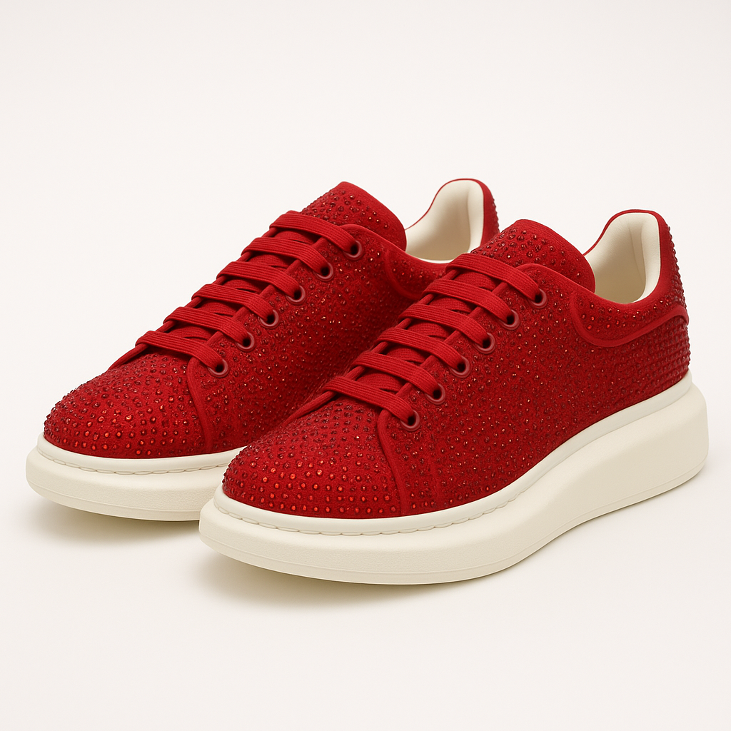 Shine in every step with bold red sneakers studded with rhinestones. A cushioned platform sole adds height and all-day comfort, while the grippy outsole keeps you steady. Soft lining and easy lace-up fit make them perfect for parties, travel, and everyday casual looks.