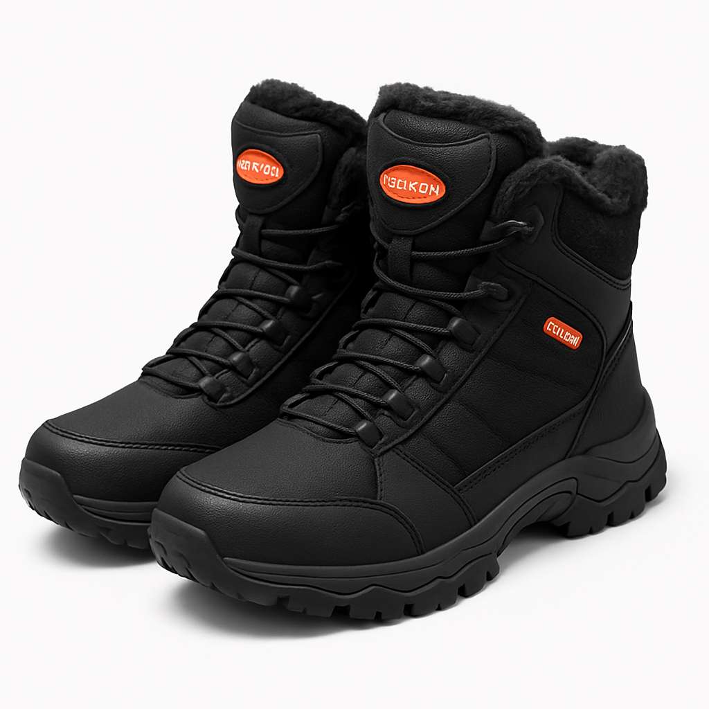 Warm, rugged black ankle-high boots with plush lining and a chunky, grippy outsole—built for cold weather comfort.