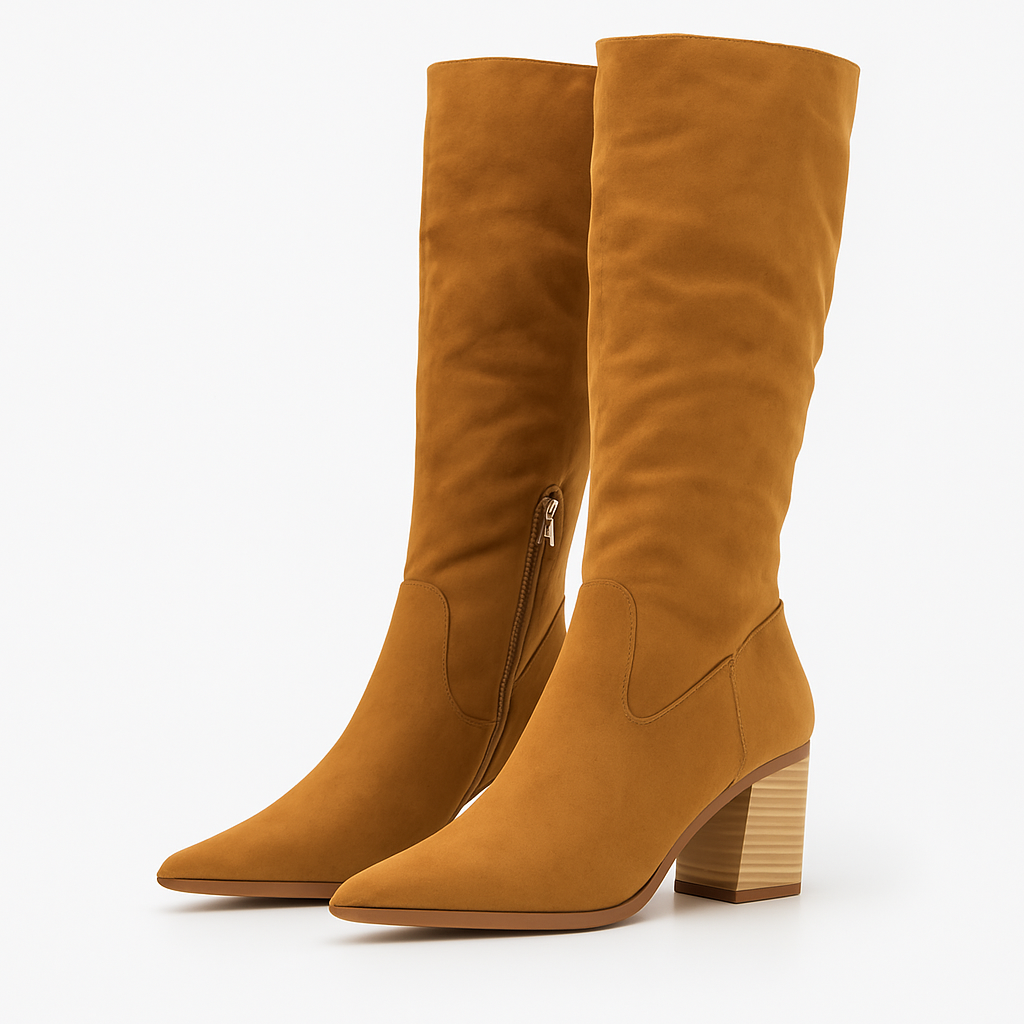Soft tan faux-suede boots with stacked block heel, side zipper and pointed toe.