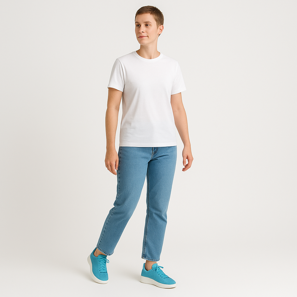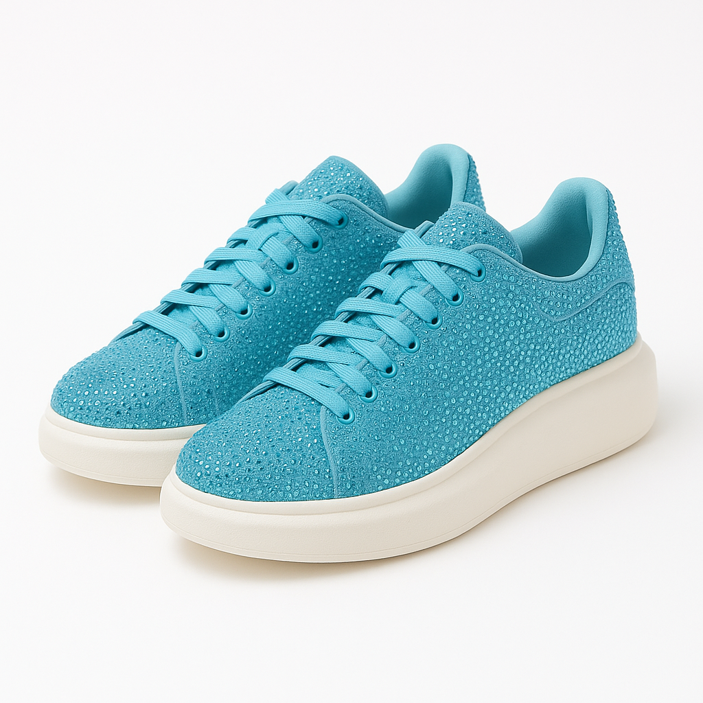 Make every step shine with these turquoise rhinestone sneakers. A sparkle-studded textile upper pairs with a cushioned insole and a chunky, lightweight sole for day-long comfort and eye-catching style. Flat laces and a padded collar keep the fit secure, while the clean white midsole gives a modern, elevated look. Designed as unisex fashion sneakers in India size 11, they?re perfect for casual outings, travel, concerts, or weekend wear where you want comfort with a bold pop of color